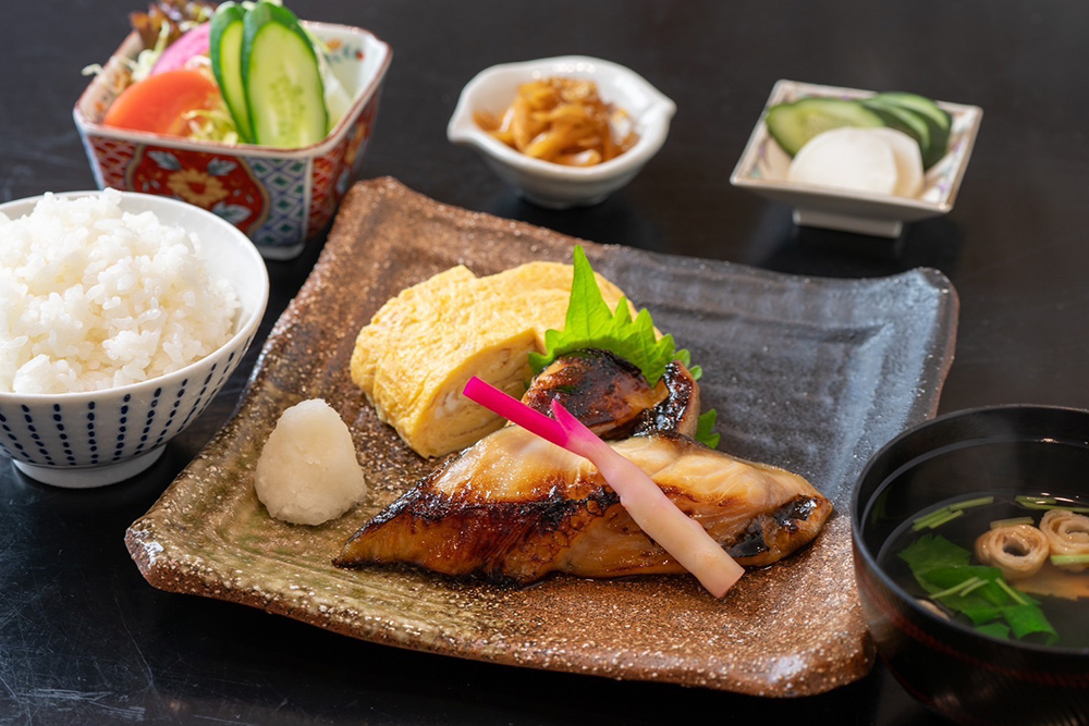 例)小鉢三点盛・塩鯖焼・たれカツ・お刺身・ごはん・汁